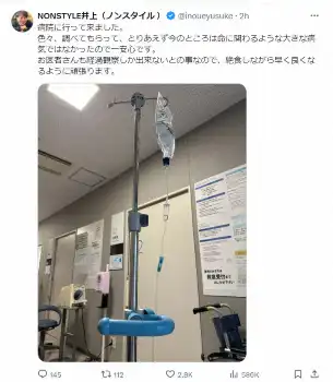 お笑いコンビ「NON STYLE」の井上裕介(44)が26日までに自身のX(旧ツイッター)を更新。体調不良で急遽、病院で受診したことを明かした。