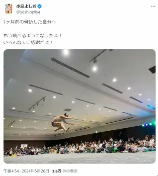 先月、番組収録で骨折したタレントの小島よしお(43)が26日、自身のX(旧ツイッター)を更新。驚異的回復を報告した。