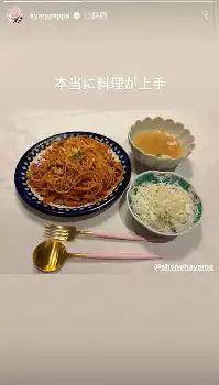 きゃりーは「本当に料理が上手」とつづり、パスタとサラダ、スープが並べられた写真を投稿。葉山のインスタグラムへのリンクを添えたもの。