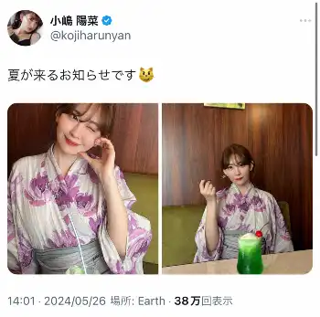 元AKB48でタレント、アパレルプロデューサーの小嶋陽菜(36)が26日、自身のX(旧ツイッター)を更新。一足早い浴衣ショットを公開し、反響を呼んでいる。
