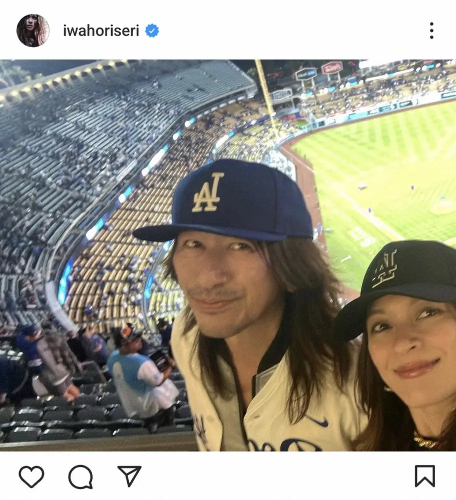 04年の5月26日に結婚した2人。岩堀は「20年結婚してる」とピースサインの絵文字と共にドジャースの帽子を被ったスタジアムでの夫婦ショットをアップ。