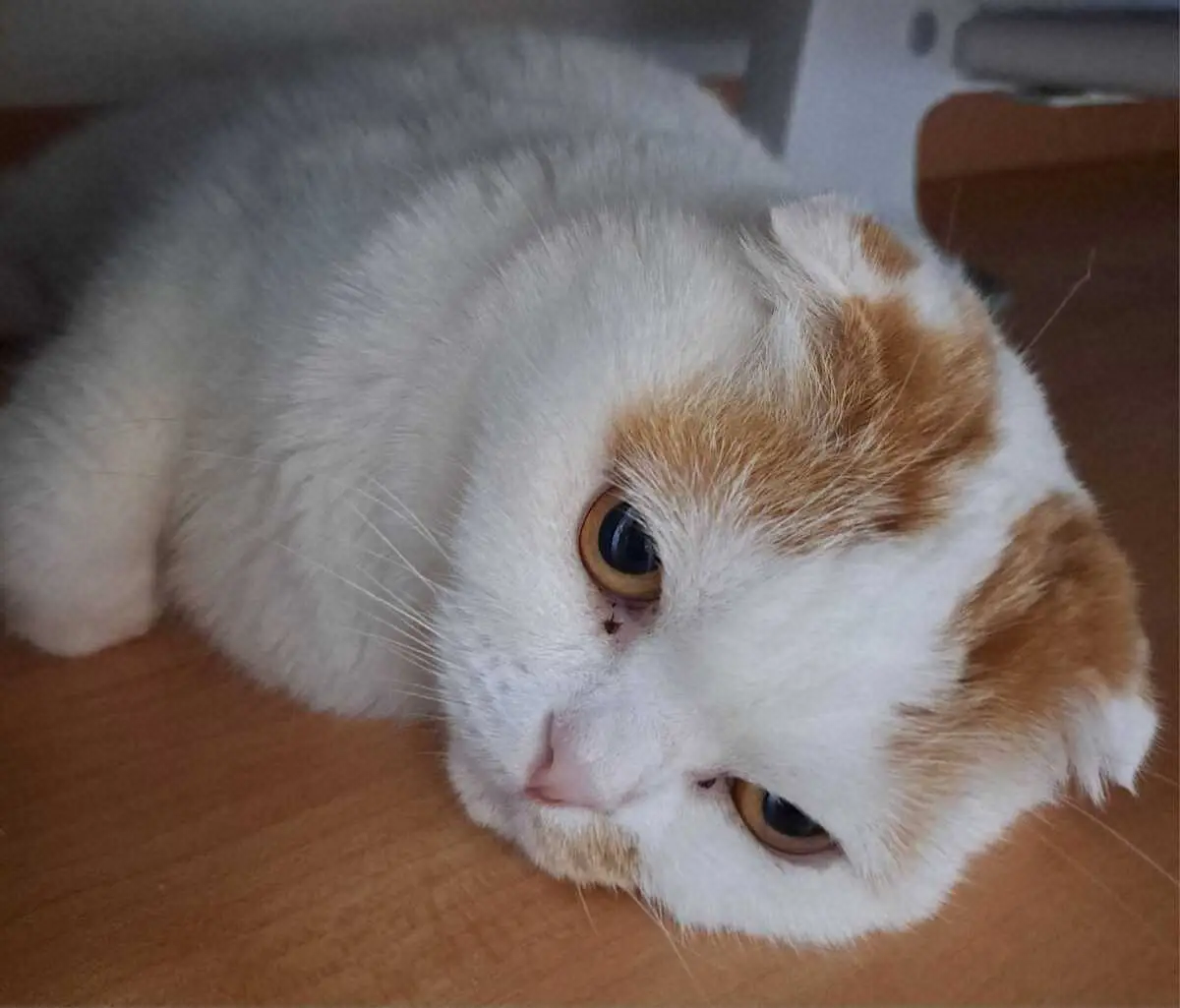 で、三男ねこ桃太郎さん。人が来たらとりあえずは警戒。ここでもう警戒心マックス。いつもは折れ耳のスコティッシュですが、いきなり耳がふわっと浮いて、目はその人にくぎ付け。体はいつでも逃げられる体勢です。