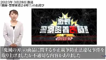 テレビ東京は28日、昨年3月28日に放送された「激録・警察密着24時!!」の放送内容について、「不適切な内容があった」として謝罪した。公式サイトを通じ、同局の島田弘久アナウンサー、末武里佳子アナウンサーが伝えた。同番組ではこの放送で、人気アニメ「鬼滅の刃」の商品に関する不正競争防止法違反事件を取り上げていたが、関係者の名誉を傷つける行き過ぎた演出があったと説明した。