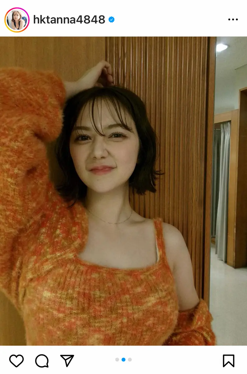 お腹がチラリとのぞいたオレンジのショート丈カーディガン・キャミソールのニットアンサンブルにデニムを合わせたコーディネートを披露した村重。そのうえで「『クレジットカード一括払いで!』←これ言いたくて仕事頑張ってるみたいなもんです」とつづった。