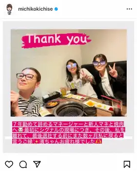 この投稿にフォロワーからは「新旧マネジャーさんとの食事会!これからも良いお付き合いをしてください」「いつも素敵なマネージャーさんに囲まれいるんですね」「素敵なご縁ですね」「これからもずっとずっと仲良しでいて下さいね」などのコメントが寄せられている。