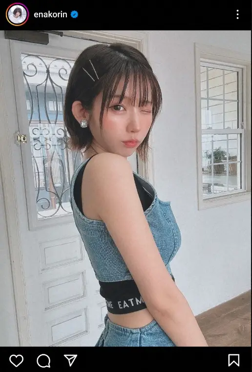 顔の絵文字とともに、デニムのショート丈のトップスでウエストをのぞかせ、ウインクしている写真をアップした。
