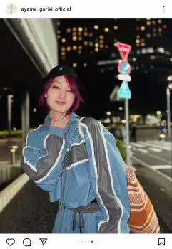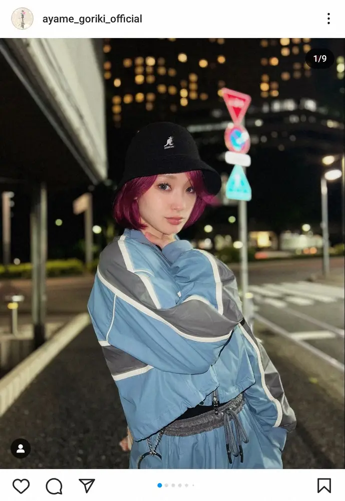剛力は「1日限定ピンクボブ」とコメント。スポーティーなセットアップで、夜の街角でポーズを取る姿を披露した。