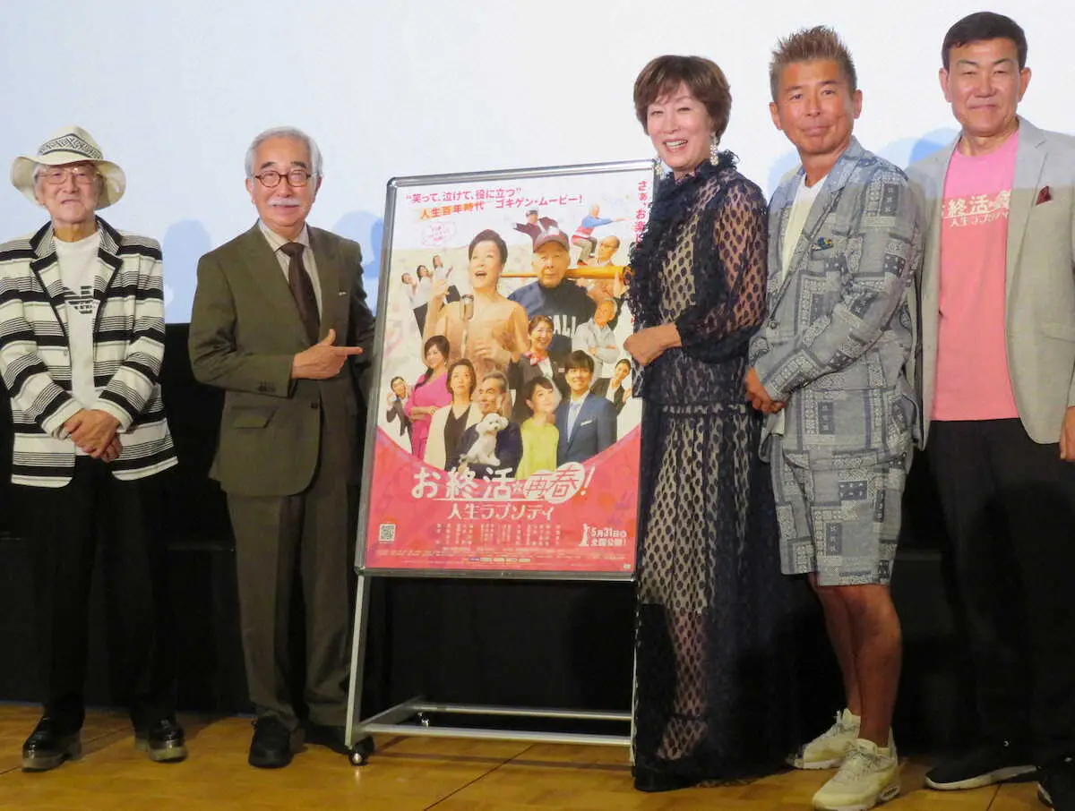 映画「お終活 再春!人生ラプソディ」の舞台あいさつに登壇した(左から)浜村淳、大村崑、高畑淳子、勝俣州和、香月秀之監督