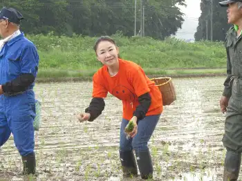 岩本は「今日はあいにくの天候となってしまいましたが、お足元の悪い中みなさん来て頂いてありがとうございます。30周年を迎え、益々精力的に動いていきたいと思います。みなさんの健康や豊作を願って植えていきます。今日は一緒に楽しい時間を過ごしましょう」とあいさつ。途中雷も響く中一緒に参加した地元の方達と共に雷にも負けず着々と愛情を込めて作業を行い、無事全ての苗を植え終えた。