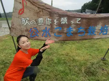 地元の方や見学者も含め約60人が見守る中、田植え機を使わずに「公水こまちTシャツ」とジーンズに長靴を履いて、腰に籠をつけての昔ながらの手植えスタイルで作業を行った。苗は、地元のブランド米「あきたこまち」を、田植えから収穫まで岩本自身が手掛け、自身の歌唱楽曲を聴かせて育てるため、名前にちなんで「公水(くみ)こまち」と命名。この日はあいにくの悪天候だったが、約1時間一本一本丁寧に行った。