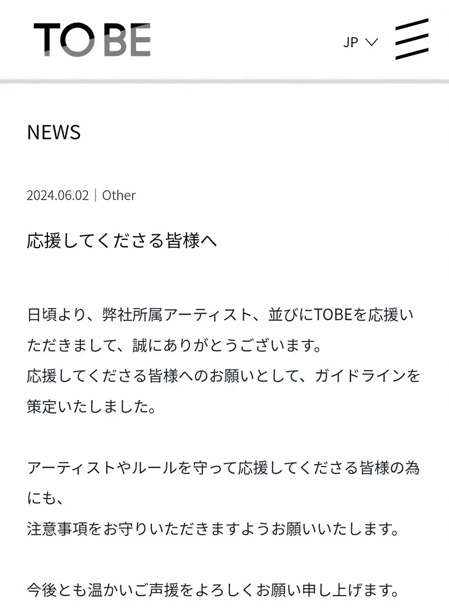 サイトには「日頃より、弊社所属アーティスト、並びにTOBEを応援いただきまして、誠にありがとうございます。応援してくださる皆様へのお願いとして、ガイドラインを策定いたしました。アーティストやルールを守って応援してくださる皆様の為にも、注意事項をお守りいただきますようお願いいたします。今後とも温かいご声援をよろしくお願い申し上げます」との文章が掲載され、策定されたガイドラインも公開された。