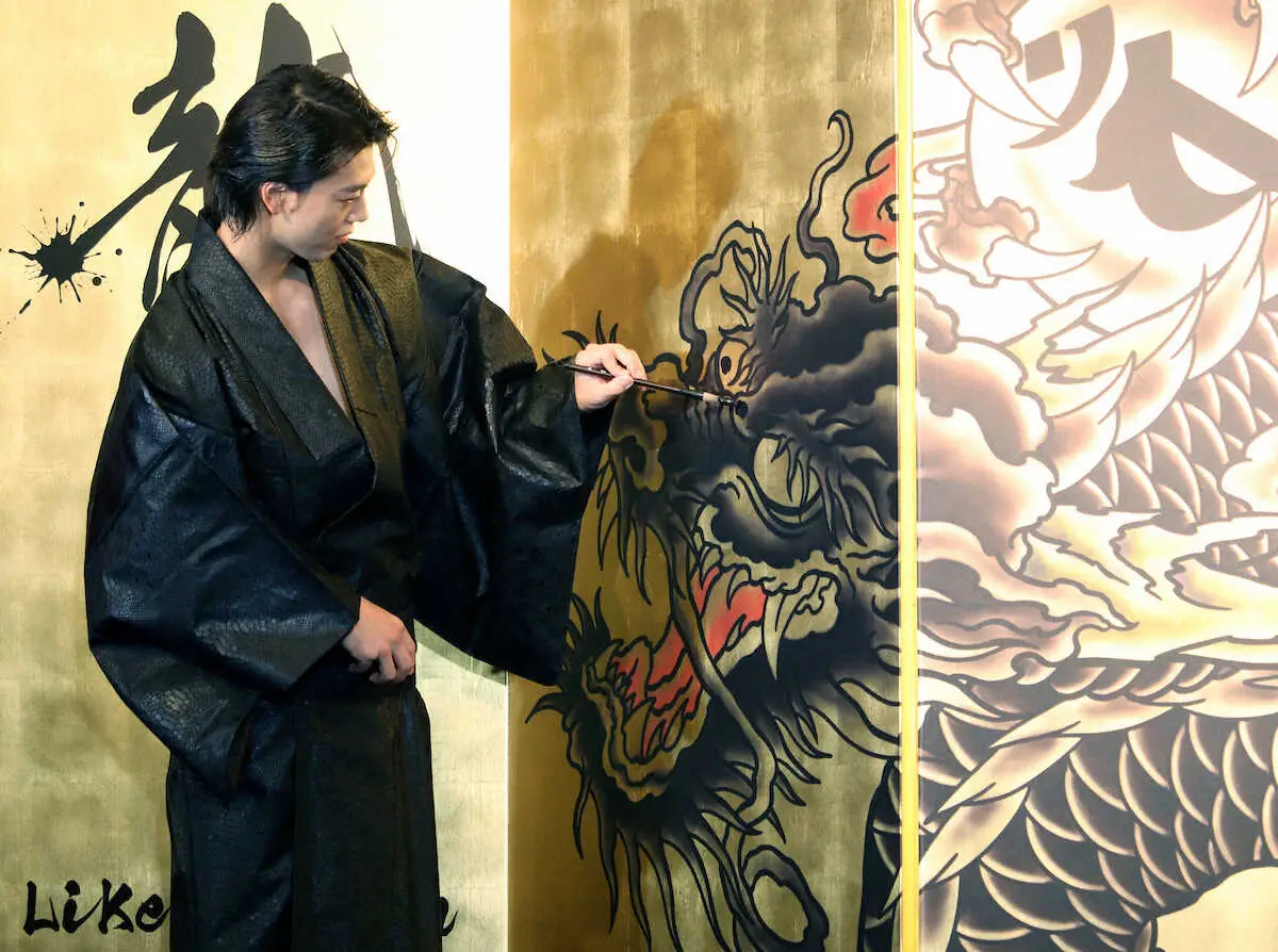 ヒット祈願で主人公が背負う入れ墨の竜を描いた金屏風(びょうぶ)に目を入れたが、距離感がうまくつかめず眉間に描いてしまう痛恨のミス。結果、三つ目の竜になり「これ、消せませんかね」と苦笑いだった。