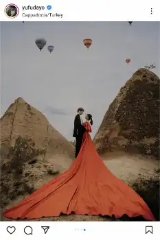 「カッパドキアのツアーで撮ってもらった写真たち」と書き出すと、洞窟内での黒のドレス姿のショットや、気球をバックにスーツ姿の上田とオレンジのドレス姿の自身が見つめ合うショットなどを投稿した。
