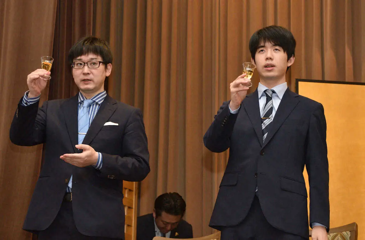 藤井は今期を制すれば5連覇となり、自身初の永世称号を手にする。相手は、独創的な指し回しを得意とする山崎。藤井は「未知の局面での対応力や判断力が問われるシリーズになると思う。集中して臨み、皆さんに楽しんでもらえたら」と気合を入れた。前夜祭では、ノンアルコールの梅酒で乾杯。藤井は一口味わい、多くのファンからの拍手や声援を受けながら会場を後にした。