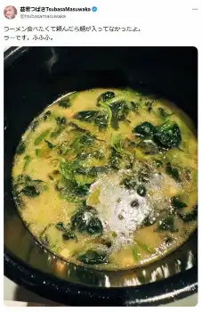 この投稿にフォロワーからは「まさかの麺無し」「麺入れ忘れたのかな?」「つーちゃん持ってるなー笑」「そんなことあるんだね!?」「ラーだけかい」「ダイエット中?」などの声が寄せられた。