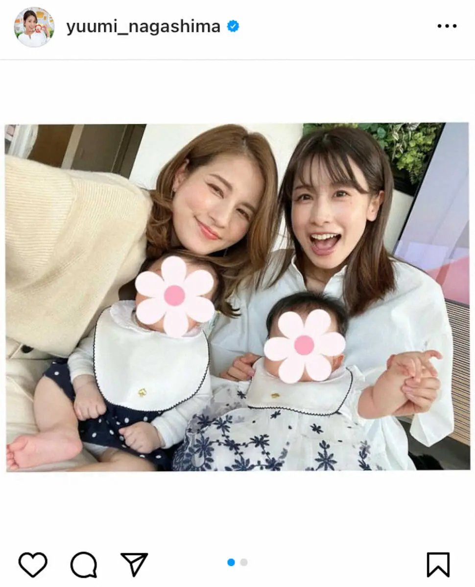 フジテレビ・永島優美アナウンサー(32)が、7日に自身のインスタグラムを更新。フリーアナウンサーの加藤綾子(39)と、仲良く我が子を抱いている写真を掲載した。