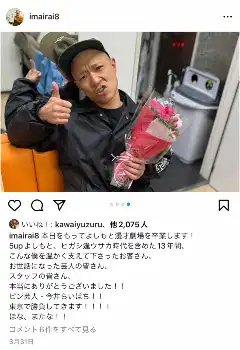 今井は20年にお笑いコンビ「ヒガシ逢ウサカ」を解散後、「今井らいぱち」に改名しピンで活動。名付け親は盛山。その年の「オールザッツ漫才2020」で「和牛」の川西賢志郎のモノマネで優勝を果たすなど活躍し注目を集めた。大阪のよしもと漫才劇場を卒業し、今年の春、活動拠点を東京に移した。