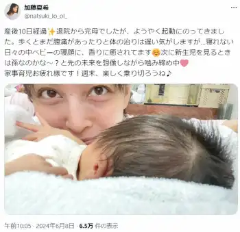 今年5月に第4子となる女児を出産した女優の加藤夏希(38)が、10日までに自身のX(旧ツイッター)を更新。産後の様子について、写真とともに現在の心境を打ち明けた。