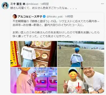 2児の父である平子は休日に「不定期開催の『娘様と遊ぼう』の日。リクエストに応えてたら高円寺→吉祥寺→お台場→新宿と、都内大回りのイカれたコースに」と、長女と都内散歩を楽しんだ様子を公開。続けて「お笑い芸人のミキの弟さんの方をお見かけしたので写真をお願いしたら快く撮って下さった。とても気さくな方でした」と、亜生と愛娘の2ショットを公開した。