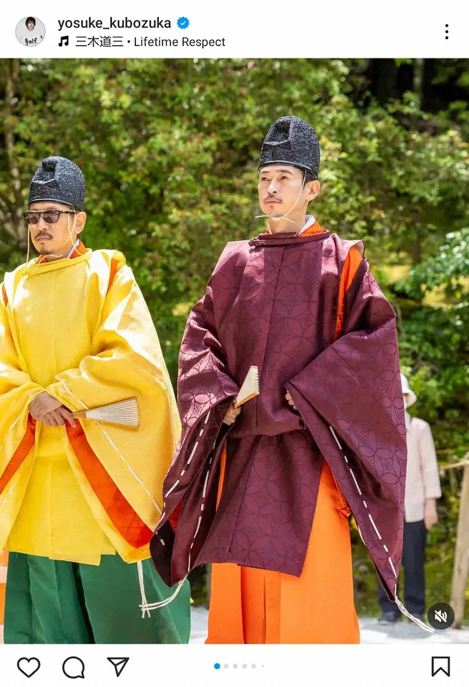 この投稿にフォロワーからは「これが大河ドラマのシーンだと言われても納得の世界観」「三木さん衣装もラスタカラー」「威厳を感じます」「これはキテるねー」「光源氏ですか?」「平安の貴族のごと、よくお似合いで」などの声が寄せられた。