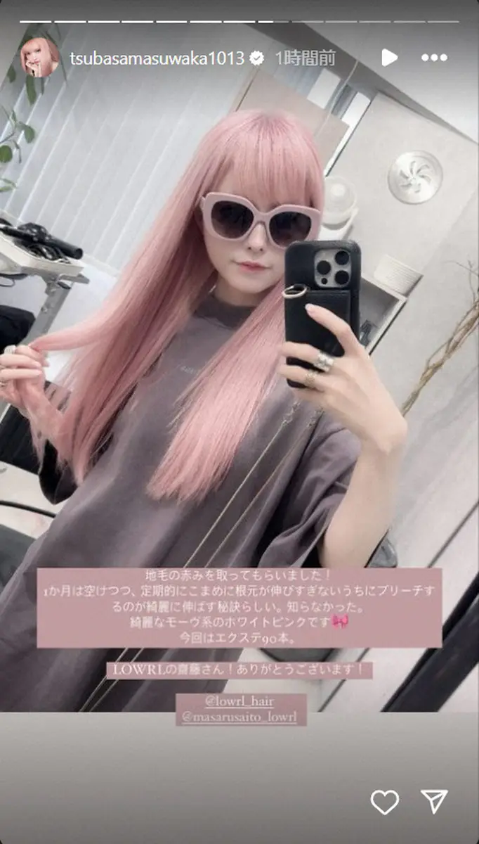 「1か月は空けつつ、定期的にこまめに根元が伸びすぎないうちにブリーチするのが綺麗に伸ばす秘訣らしい。知らなかった」といい「綺麗なモーヴ系のホワイトピンクです 今回はエクステ90本」と紹介した。