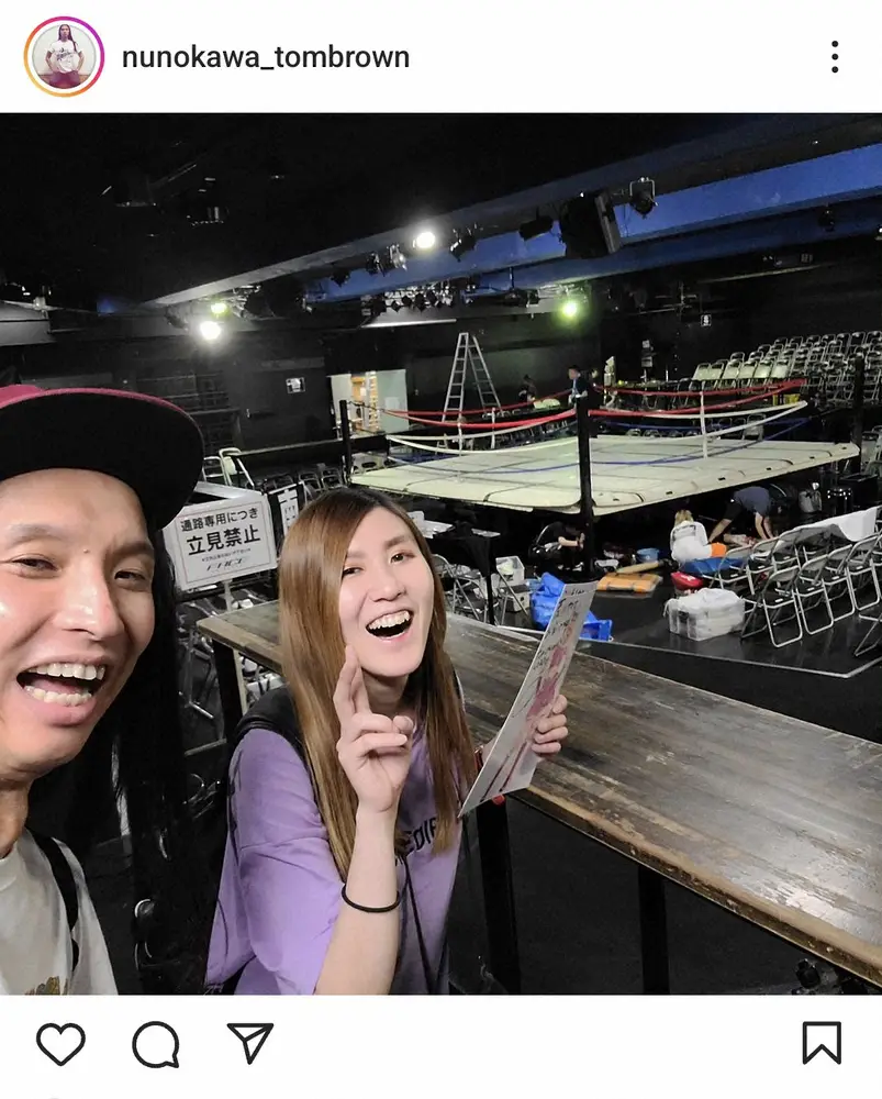 「トム・ブラウン布川です。センダイガールズのプロレスをチバナガレヤマガールズと観に行きました」と書き出すと、プロレスのリングをバックにしての自身とお笑いコンビ「納言」の薄幸との2ショットをアップ。