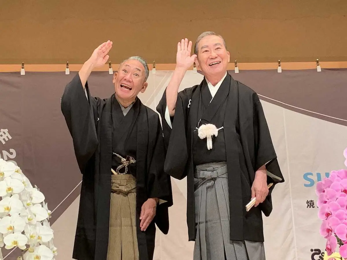 桂文枝(右)と林家正蔵が2人揃って「いらっしゃ~い!」のポーズを披露