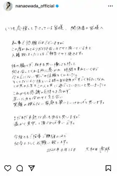 大和田は「いつも応援してくださっている皆様、関係者の皆様へ」と書き出すと、「私事で恐縮ではございますがこの度かねてよりお付き合いさせていただいている方と入籍いたしましたことをご報告させていただきます」と直筆の文書で報告した。
