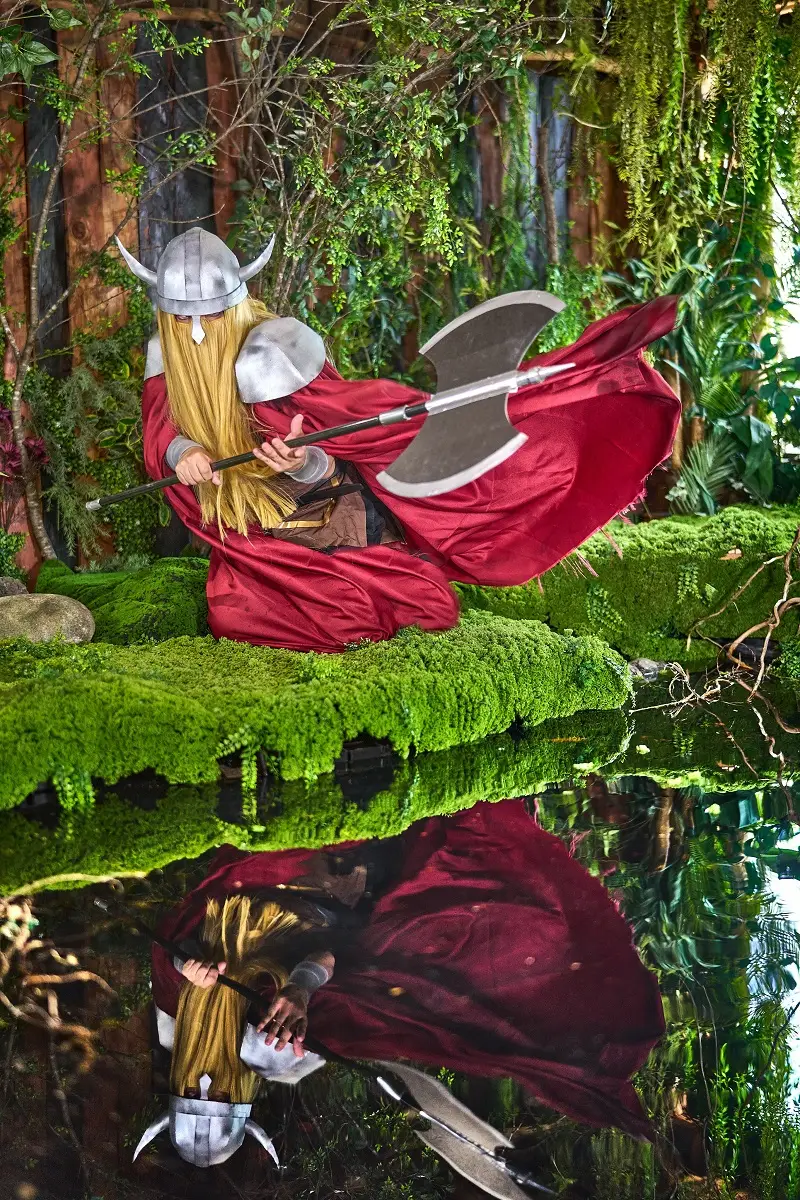 「キャラクターの躍動感を特に大事にしています。マントに動きが出るように左手でマントを真横に投げています。投げた後に素早く手を引き、斧に手を添えたところでカメラマンさんが上手くタイミングを合わせて切り抜いてもらったので、迫力のある写真になりました。