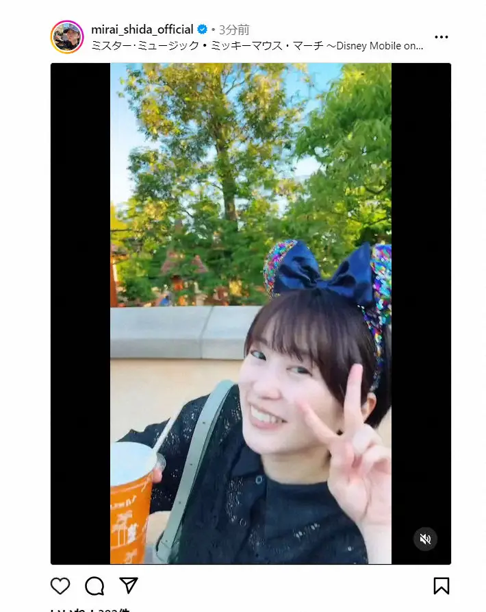 ミニーマウスのカチューシャを着用し、カメラに向かってピースサインする様子など自然体の姿を披露した。