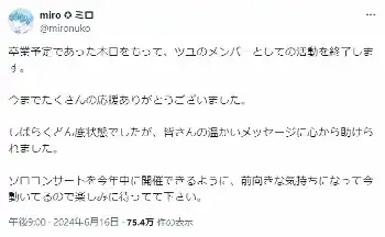 男女3人組音楽ユニット「ツユ」のメンバー・miro(ミロ)が、17日までに自身のSNSを更新。メンバーとしての活動終了を発表した。