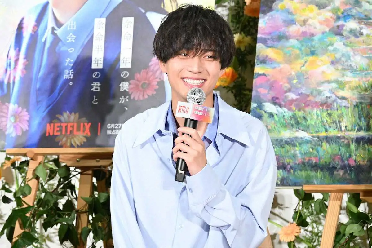 「余命…」は森田碧さんの同名小説が原作。“期限付きの恋”を描く。映画作品での王道ラブストーリーは初挑戦で「設定に対してワクワクであったり不安もあったんですけど、不安は現場入りしてすぐに消えた。初めてにしては気負わず自分らしく過ごせた」と振り返った。