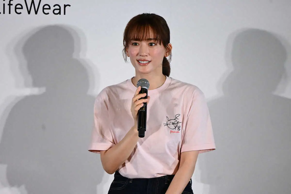 綾瀬は“PEACE FOR ALL”平和を願うユニクロのチャリティー活動に賛同し、胸元にピースサインをするキャラクターをあしらったオリジナルのTシャツを着用して登壇した。