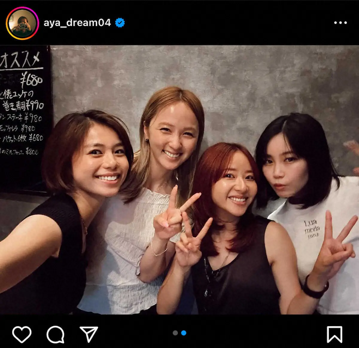 AyaはDream Ami、佐藤晴美、鷲尾伶菜との4ショットとともに「@ami_dream05 @reina.washio.official @sato_harumi__official と早めの時間から焼肉いってきたよーん」と報告。