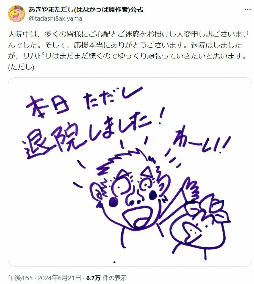 あきやまただしX(@tadashi8akiyama)から 「はなかっぱ」原作者 脳内出血から2カ月で退院 左半身まひに 命の危機… ギャラリーで見る この記事のフォト 2024年06月22日の画像一覧 もっと見る 2024年06月22日の画像をもっと見る