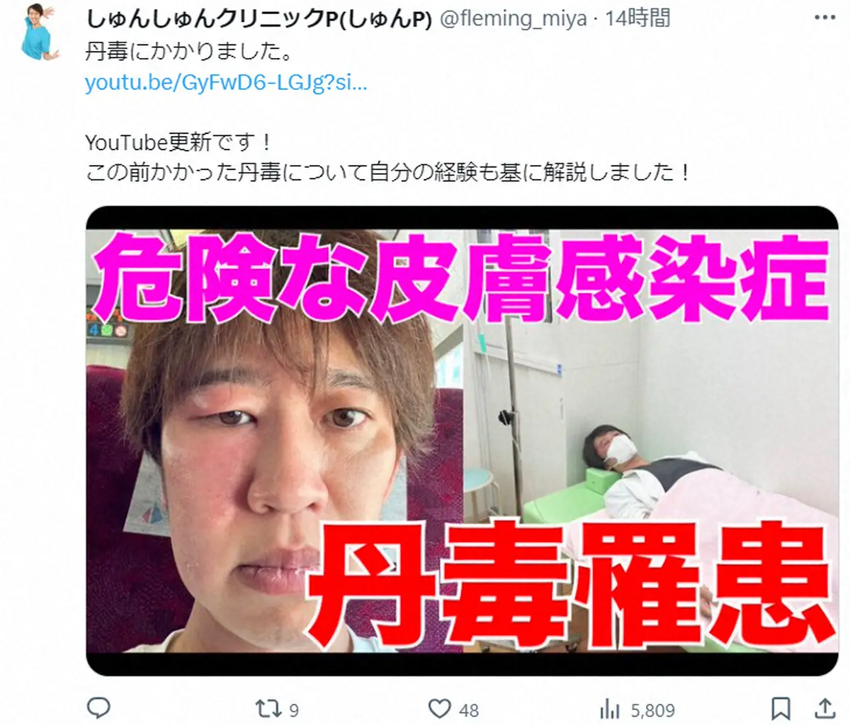 しゅんPは「丹毒という病気にかかってしまいました」と報告。「丹毒っていうのは、皮膚の浅い部分、皮膚の中の方にばい菌が入ってしまって、炎症を起こしてしまったっていうような状態です」と説明し、顔にできやすい細菌感染症だと話した。