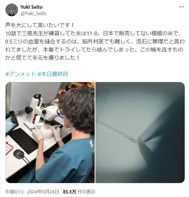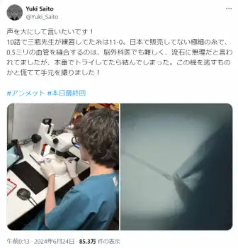 「声を大にして言いたいです!10話で三瓶先生が練習してた糸は11-0。日本で販売してない極細の糸で、0.5ミリの血管を縫合するのは、脳外科医でも難しく、流石に無理だと言われてましたが、本番でトライしてたら結んでしまった。この機を逃すものかと慌てて手元を撮りました!」と、プロの医師でも難しい縫合を練習とはいえ成功させた若葉の器用さに仰天。