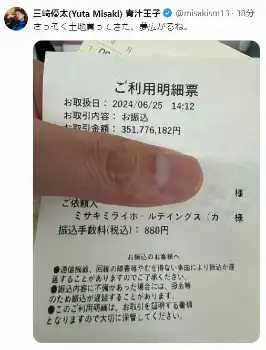 「さっそく土地買ってきた、夢広がるね」と、1枚の利用明細票を公開した三崎氏。そこには、「お取引金額:351,776,182円」と、3億5000円超の驚きの金額が記されている。