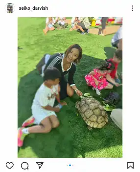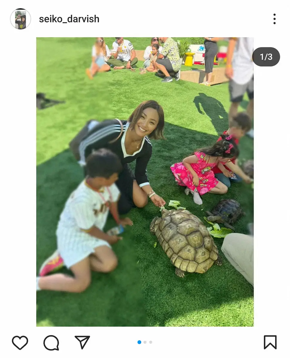 山本さんは「亀!」と書き始め、ダルビッシュのユニホームを着ている子供とともに大きな亀に葉を食べさせている姿の写真を投稿。