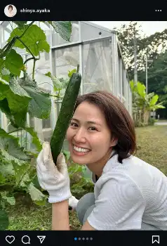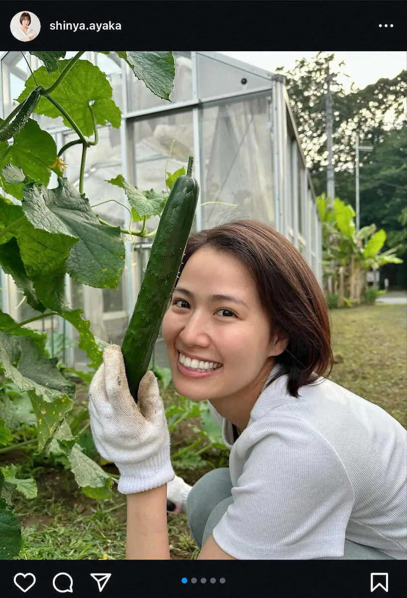 新谷は自身のインスタグラムで「夏野菜達と戯れてきました。きゅうりも、ナスもおっきく育っとったーーー!!」と笑顔で野菜を収穫する写真を投稿した。