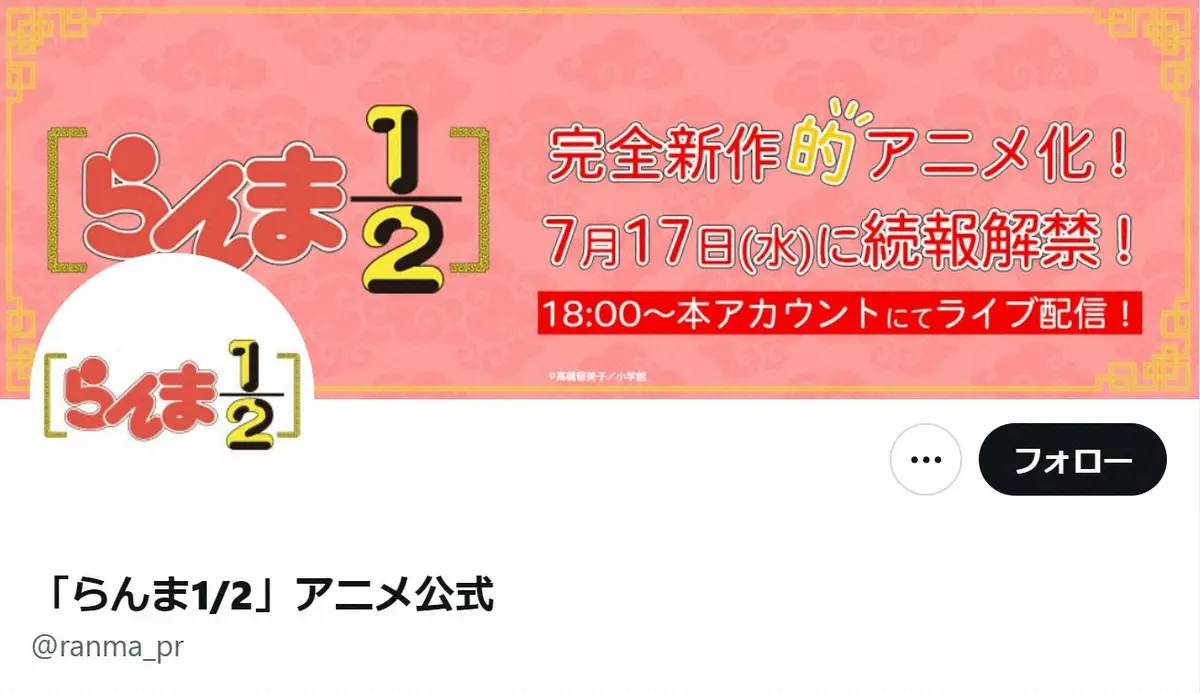 アニメの公式Xも開設され、高橋さんの投稿をリポスト。「『らんま1/2』完全新作的アニメ制作決定!#高橋留美子 先生による格闘ラブコメディーの名作を新作アニメ化します」と報告。「本日、特報PVを公開しました!」と記し、「詳細は7月17日、大発表会にて解禁!本アカウントをフォローしてお待ちください」」とした。