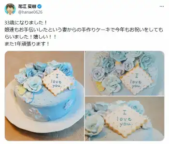 花江は「33歳になりました!」と報告。「娘達もお手伝いしたという妻からの手作りケーキで今年もお祝いをしてもらいました!嬉しい!!また1年頑張ります!」と、メッセージが書かれたクッキーと淡いブルーのバラがデコレーションされた、誕生日ケーキの写真を披露した。