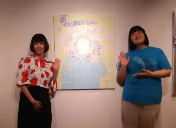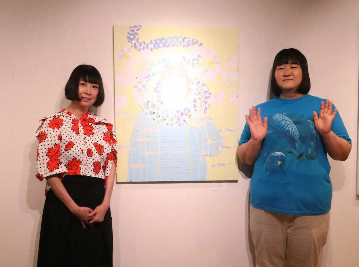 <KAORUKO個展「ANIMISM」取材会>自身がモチーフになった絵と写真に納まる「ヨネダ2000」愛(右)と作者のKAORUKO