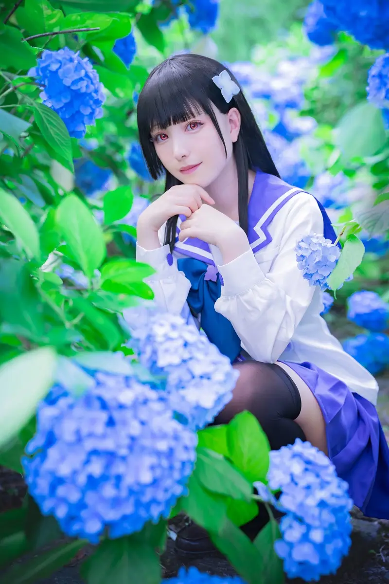 毒々しいまでに色鮮やかな紫陽花の数々。その中に透き通るような白肌の少女がしゃがみ込んでいる。その肌はまるで生気を失ったかのように青白い。ゾンビである散華礼弥の特徴を見事に再現している。さとうさんがカメラマンの月原氏(@tukihara_lgk)と表現した傑作だ。