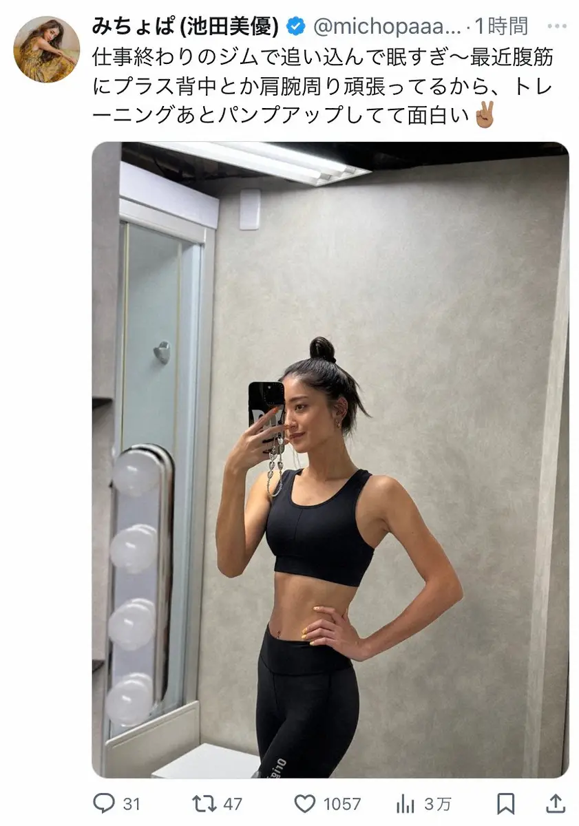 タレントの“みちょぱ”こと池田美優(25)が30日、自身のX(旧ツイッター)を更新。仕事後にトレーニングを行い、パンプアップした姿を披露した。