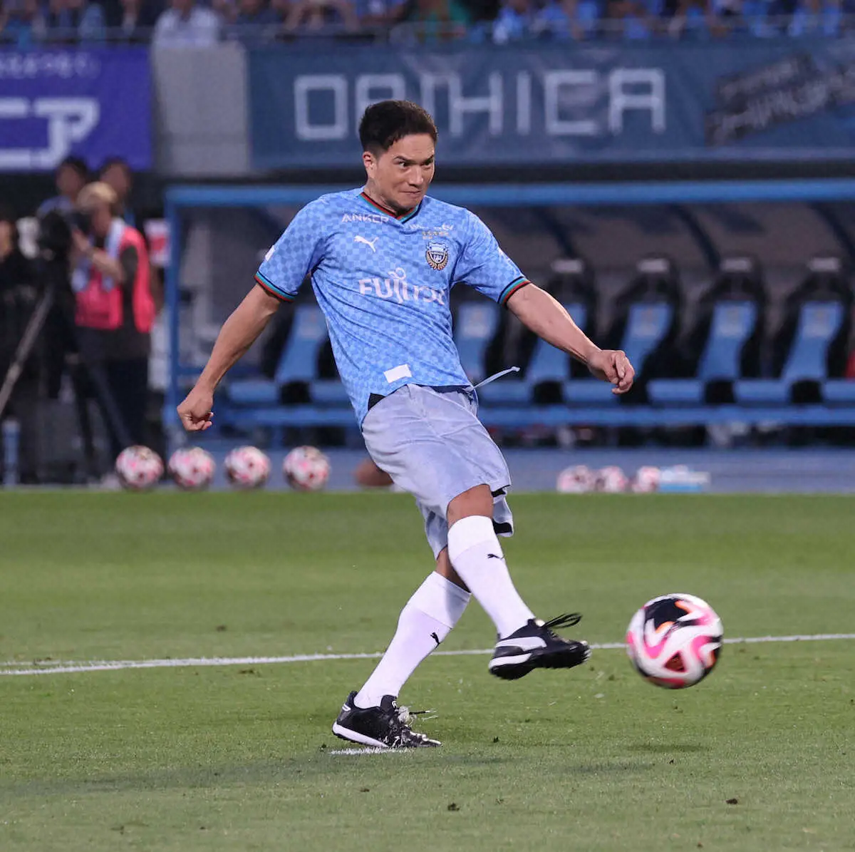 俳優の市原隼人(37)が29日、サッカーのJ1川崎F―広島戦(U等々力)の始球式で大暴れした。ホームタウンの神奈川県川崎市出身で始球式登場は15年ぶりという市原はマスコット「ふろん太」相手のPKで見事に成功すると、熱狂的なサポーターが陣取るスタンドに直行。手渡されたひしゃくで豪快に水をまき散らし、バケツの水を自身にかけるよう要求した。最後は全身びしょ濡れになりながらサポーターとともに「川崎市民の歌」を熱唱。川崎市制100周年を記念した試合を盛り上げた。
