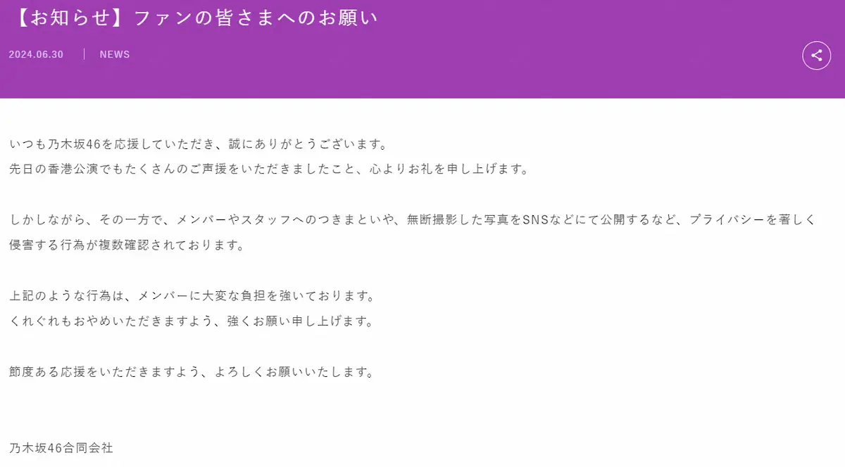 「【お知らせ】ファンの皆さまへのお願い」と題して、公式サイトを更新。「いつも乃木坂46を応援していただき、誠にありがとうございます。先日の香港公演でもたくさんのご声援をいただきましたこと、心よりお礼申し上げます」とした上で、「しかしながら、その一方で、メンバーやスタッフへのつきまといや、無断撮影した写真をSNSなどにて公開するなど、プライバシーを著しく侵害する行為が複数確認されております」と明かした。