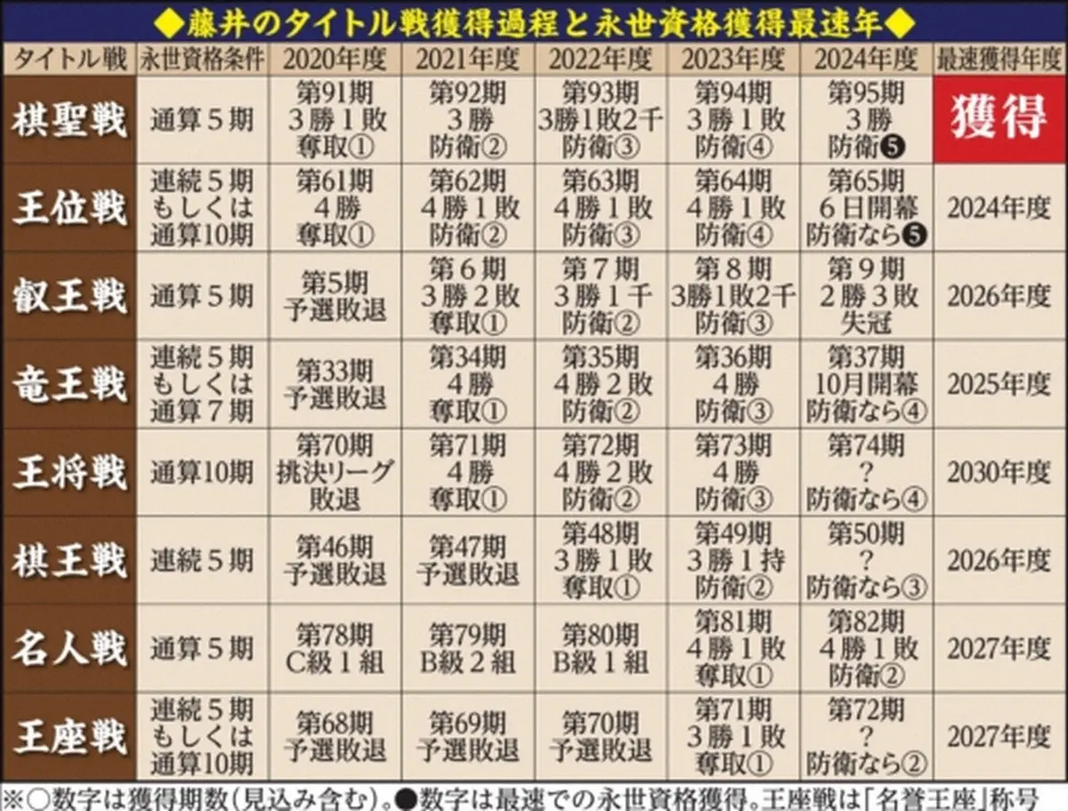 一方で5期連続のみが条件の棋王戦は連覇が一度途切れると0からやり直し。王将戦もハードルは高く、通算10期獲得を求められる。現在3連覇中の藤井はあと7期勝ち続ければ2030年度に獲得する計算だ。それまでに他の7タイトルを規定上制せば、28歳にして前人未到の「永世8冠」となる。