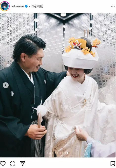 写真のみの投稿ながら、白無垢姿で、夫でラグビー日本代表のプロップ稲垣啓太(34=埼玉)と笑いながらたわむれている2ショットなどを多数アップした。
