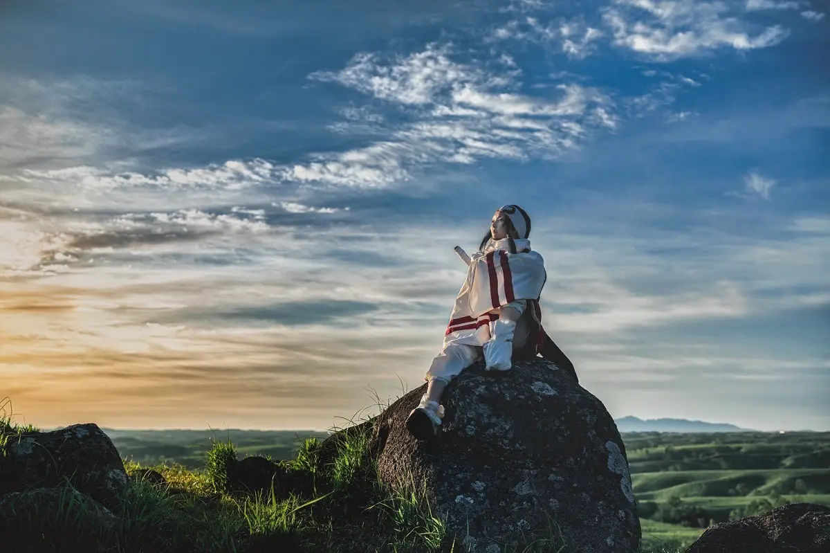 撮影に関しては、作品の広大な大地感を求め、カメラマンさんと山に登りました(笑)。カメラマンのばーさくさんは元々風景撮影を主とする方で、"レイヤー主体の構図ではなく、いかに作中の世界観に馴染んだ構図にできるか"という点を重視されていて、私もまたそれを求めていました。所謂コスプレ写真と呼ばれる物とは少し趣きが違うかもしれないと仰る反面、自分の衣装や活動にも同調して下さり、被写体を取り込んだ作品を作ってくれました。